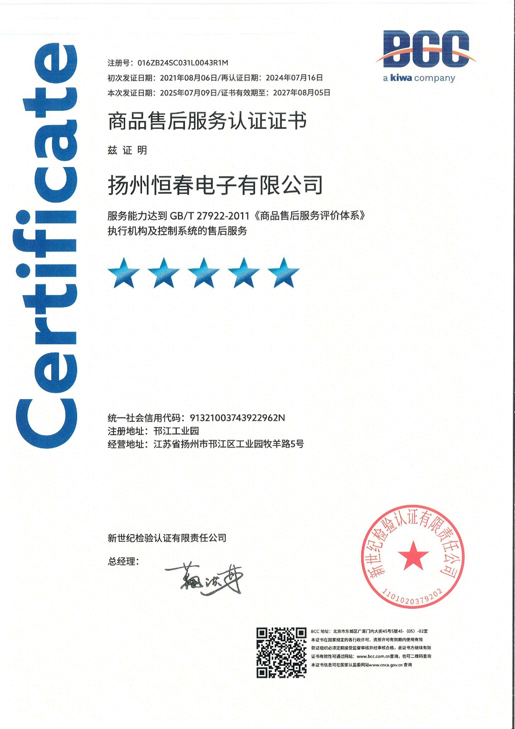 商品售后服务认证证书