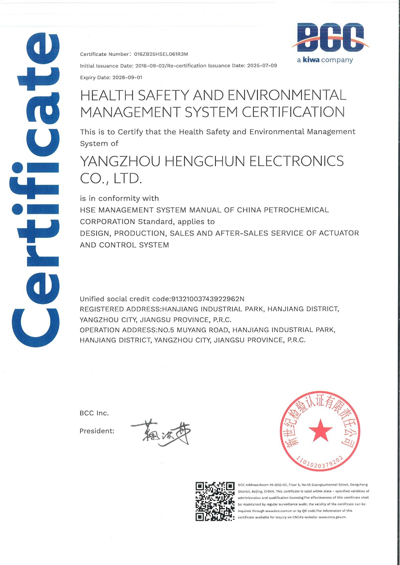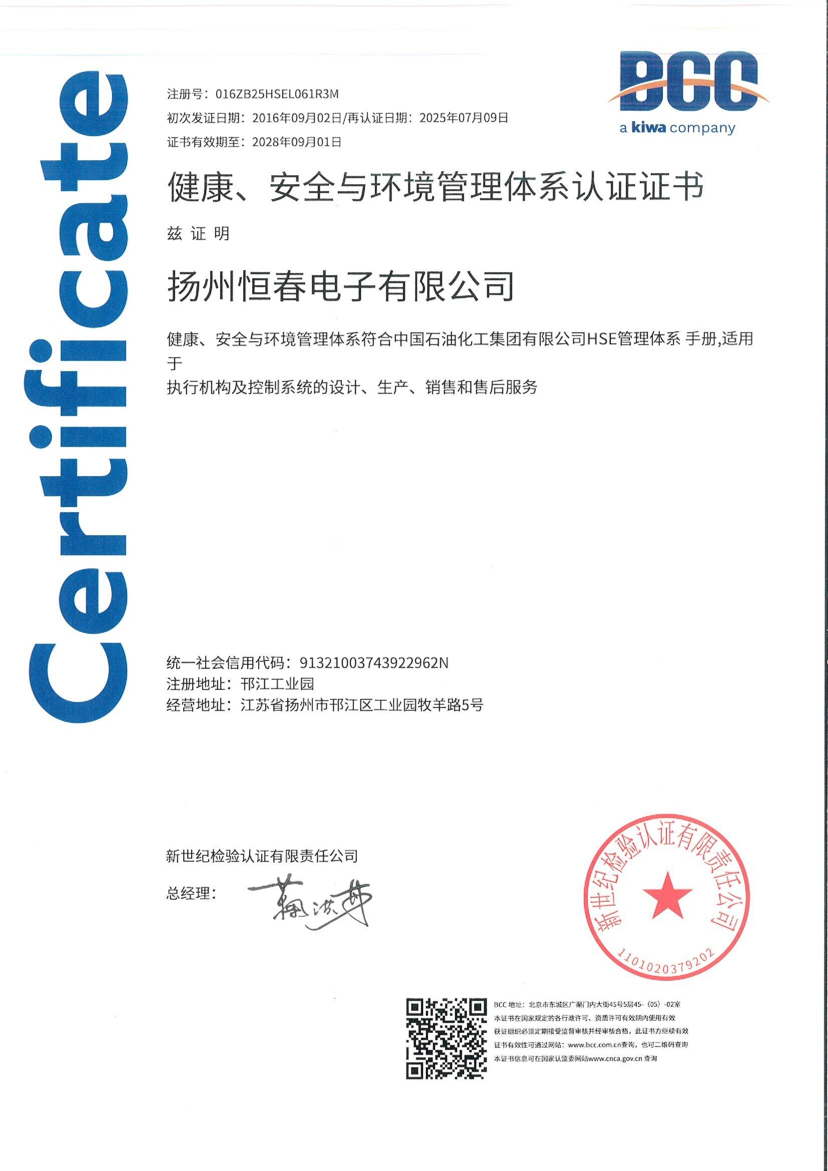 健康、安全与环境管理体系认证证书