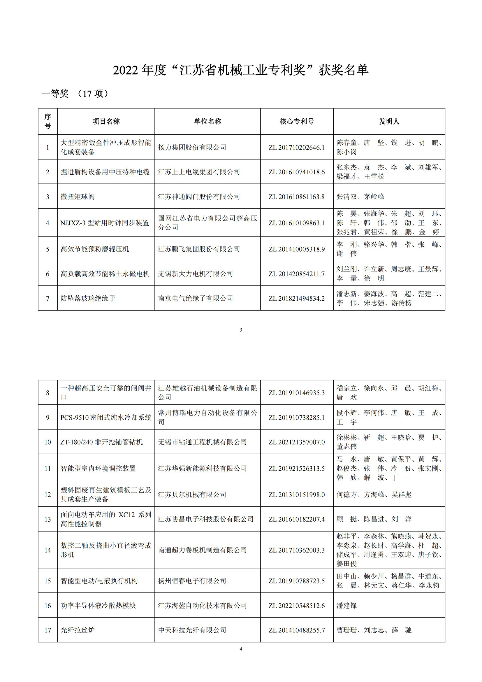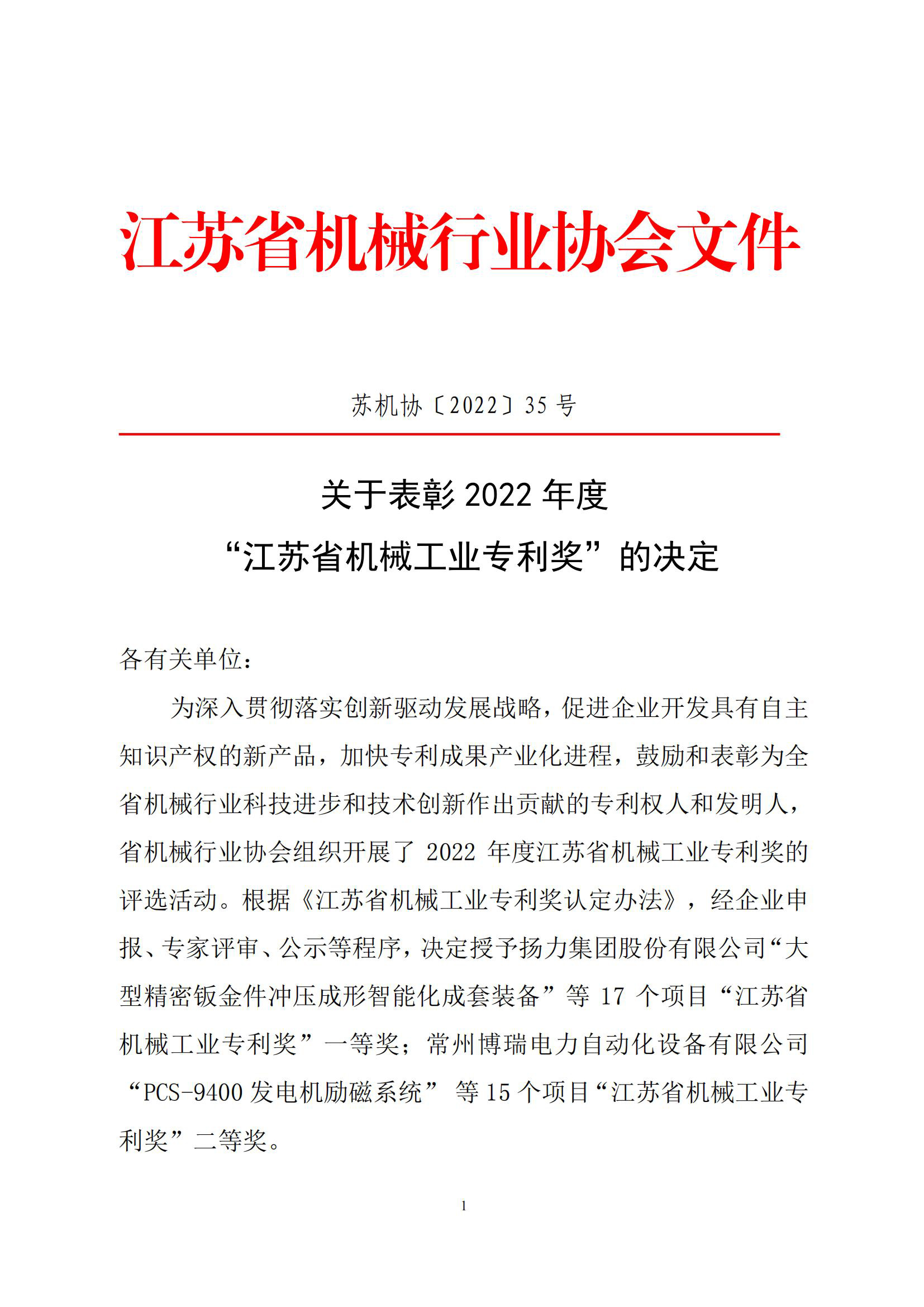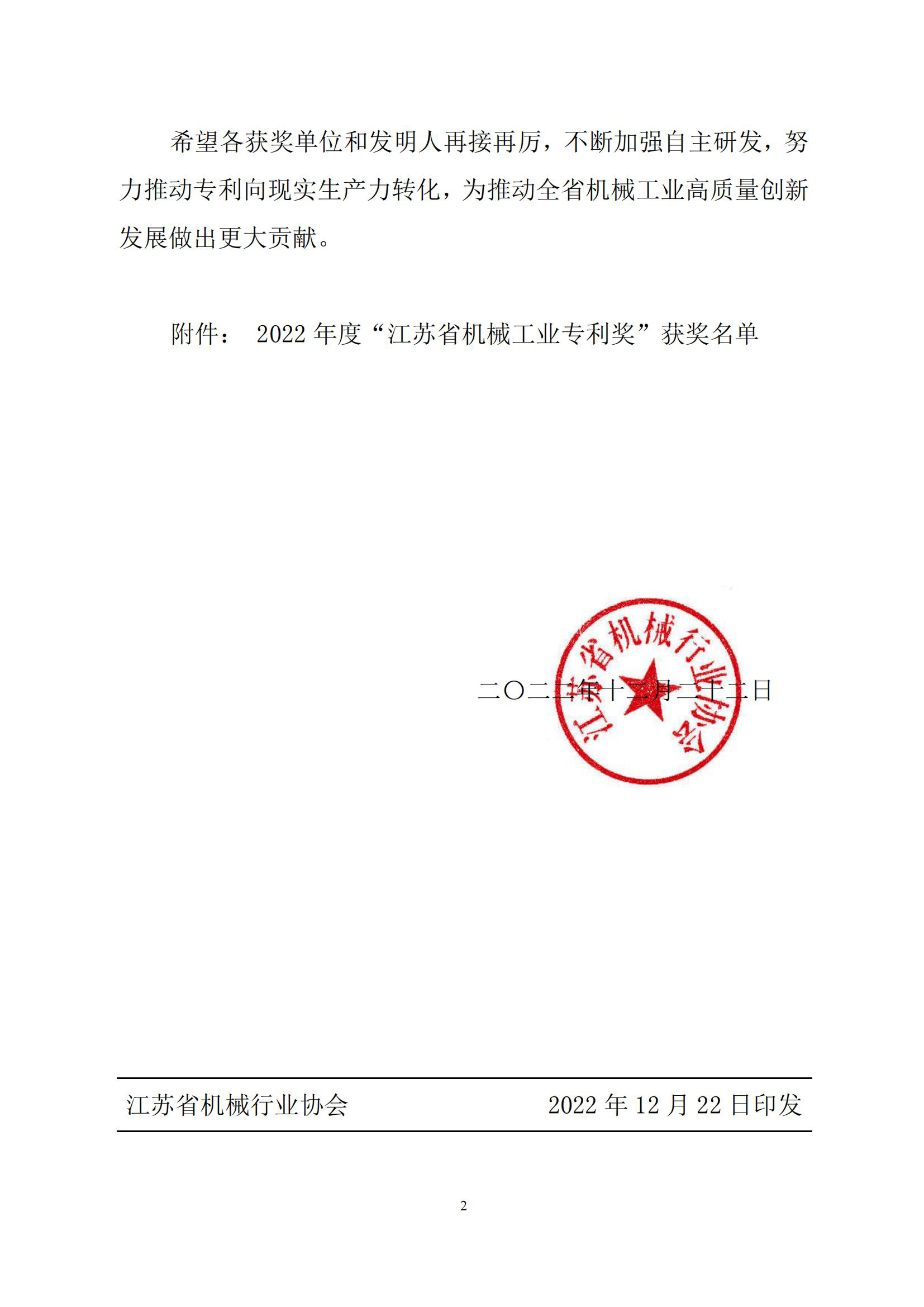 关于表彰2022年度“江苏省机械工业专利奖”的决定