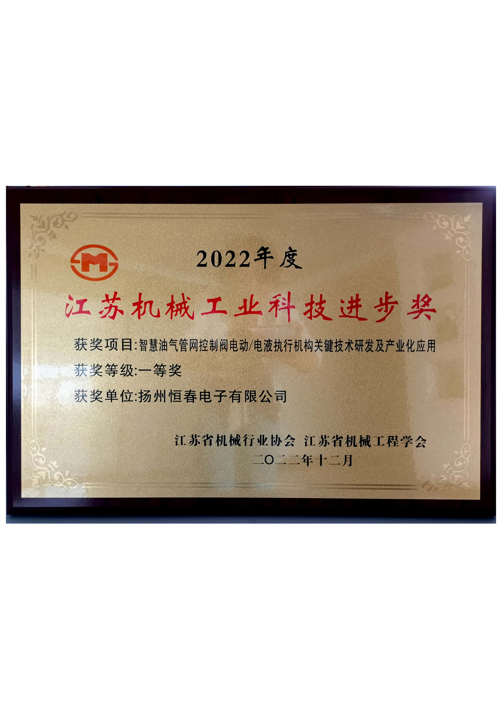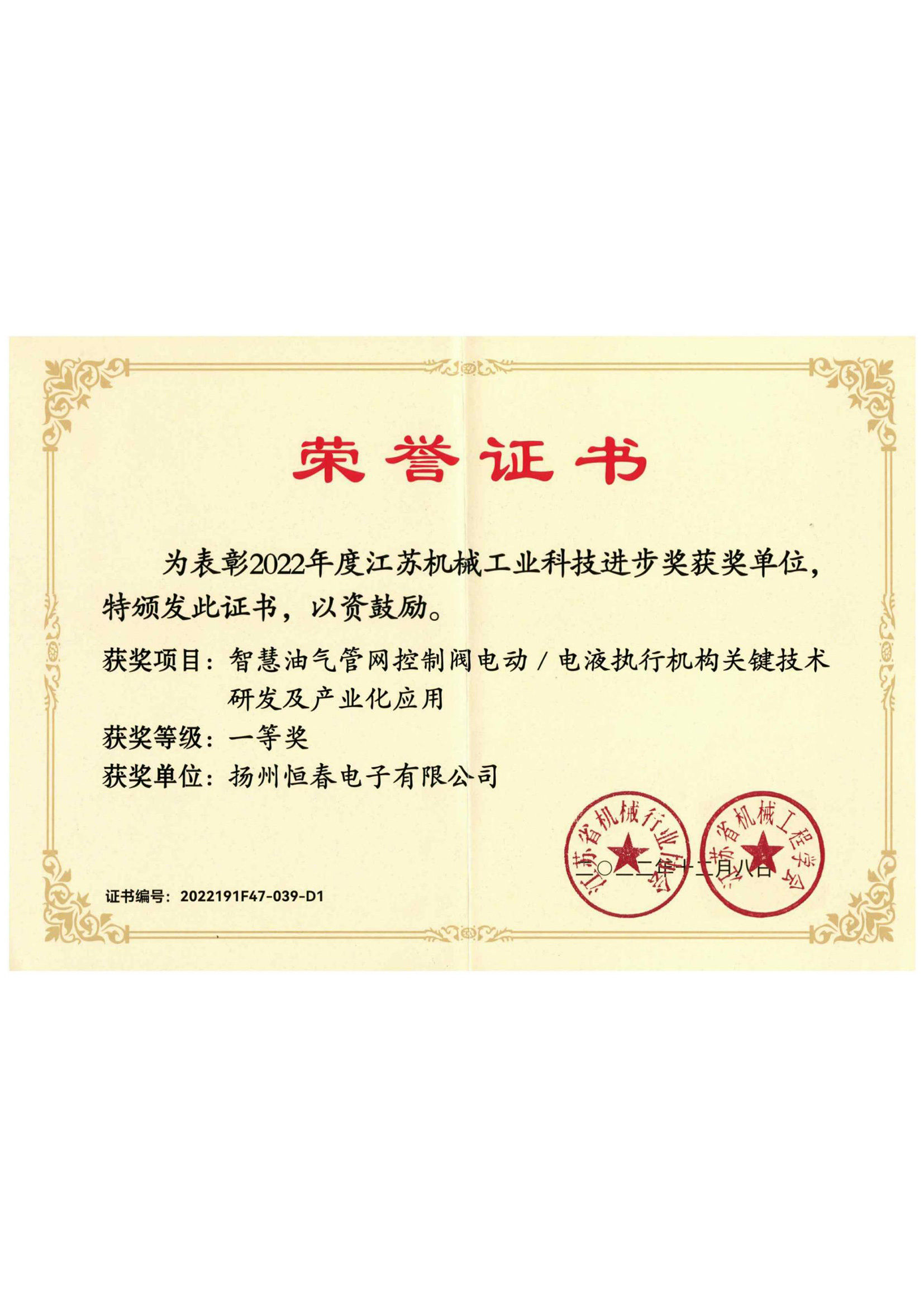 江苏机械工业科技进步奖-证书-2022