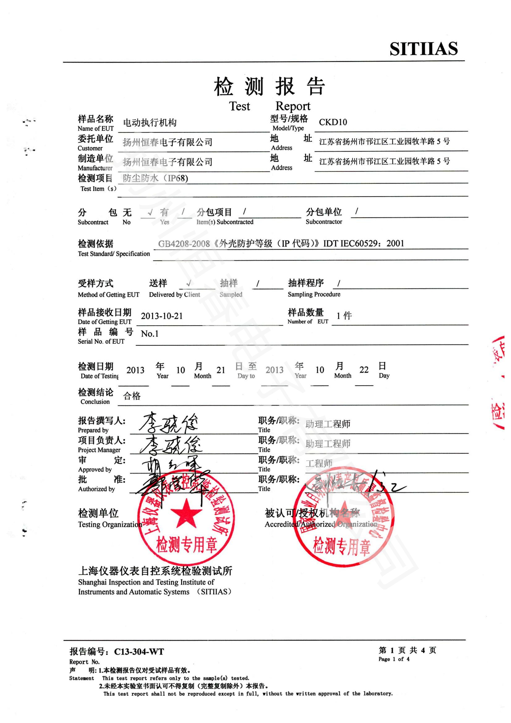 C13-304-WT 检测报告-CKD10 -防尘防水(IP68)