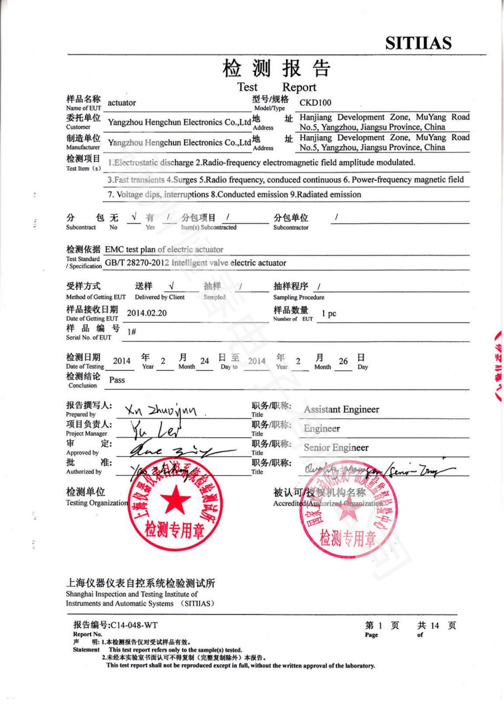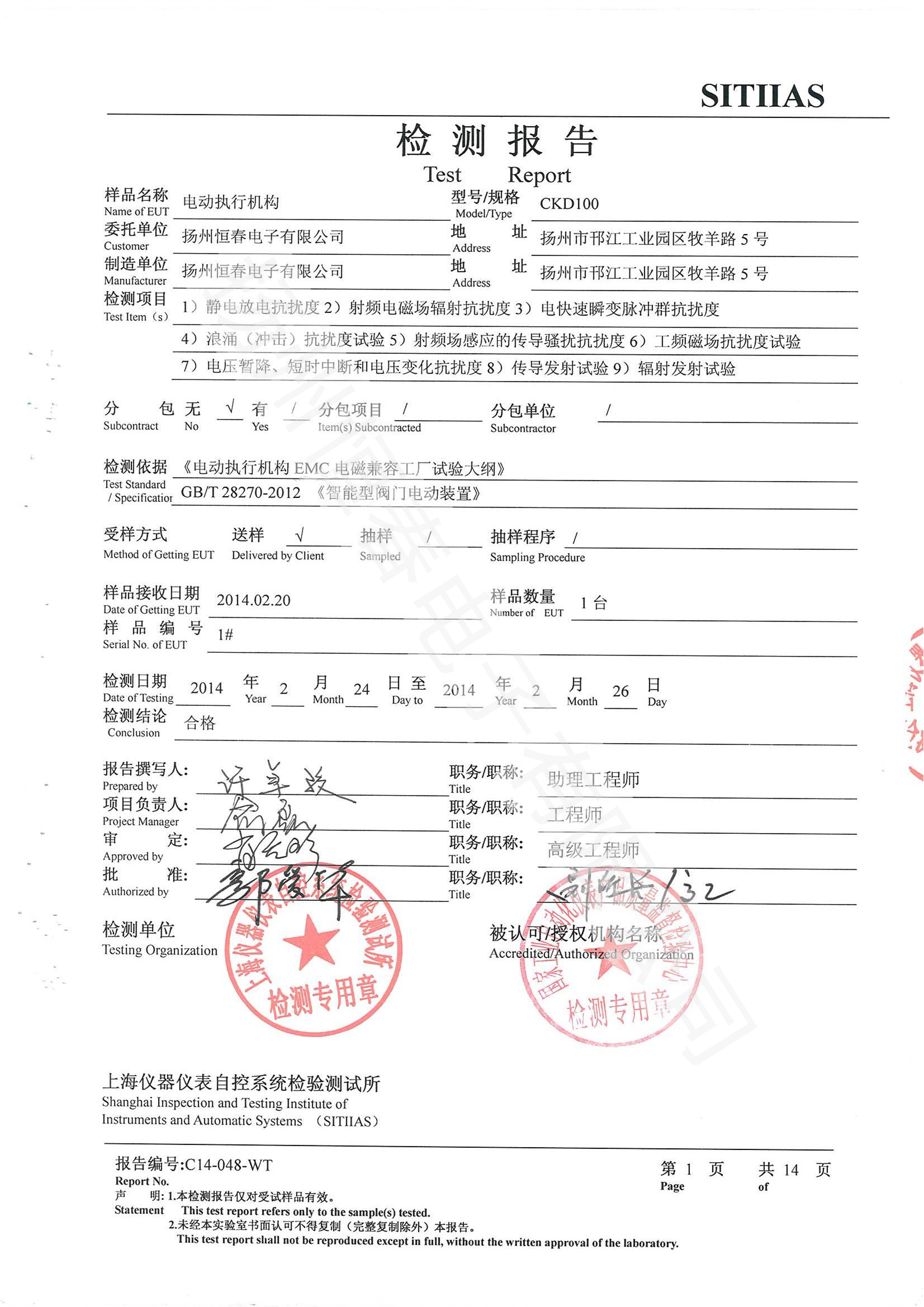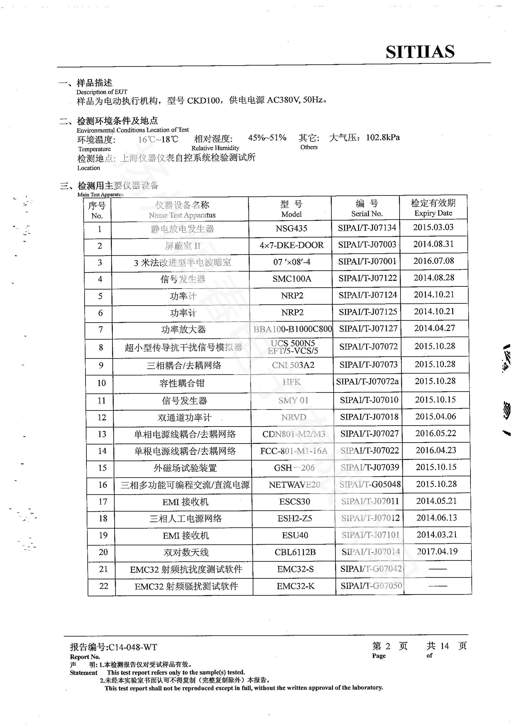 C14-015-WT 检测报告-CKD100 -振动、环境温度、湿热、高低温冲击