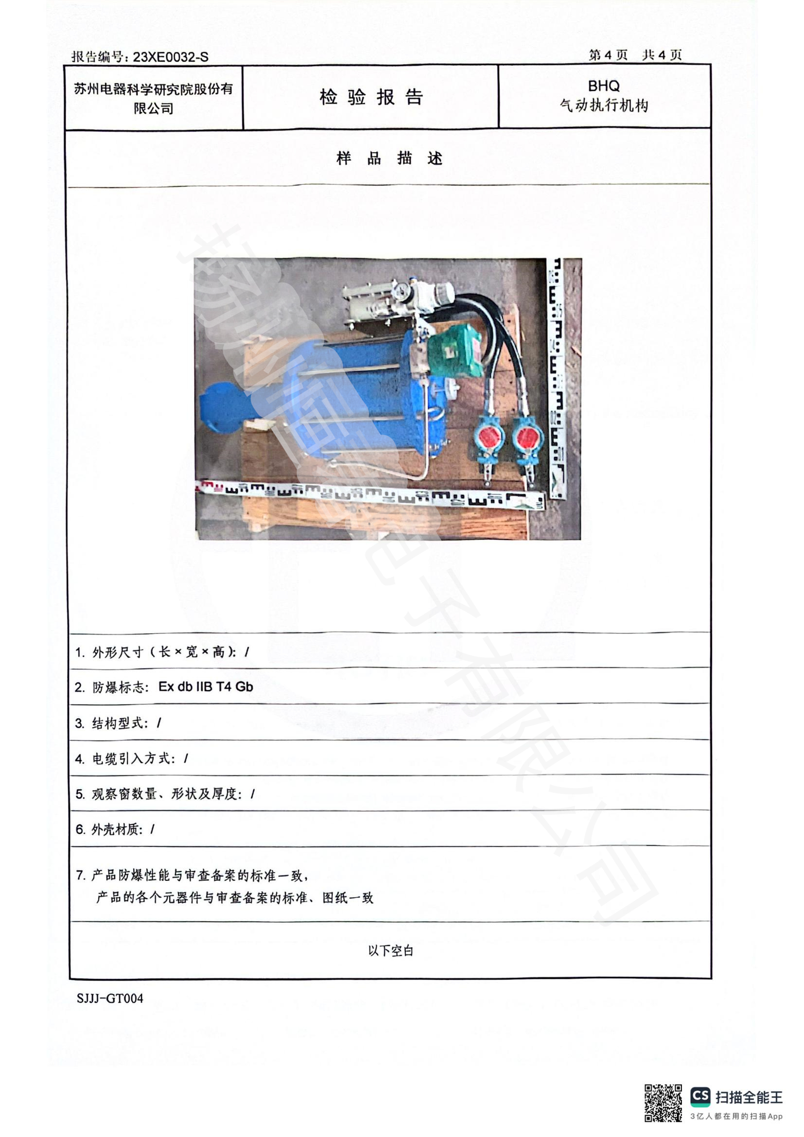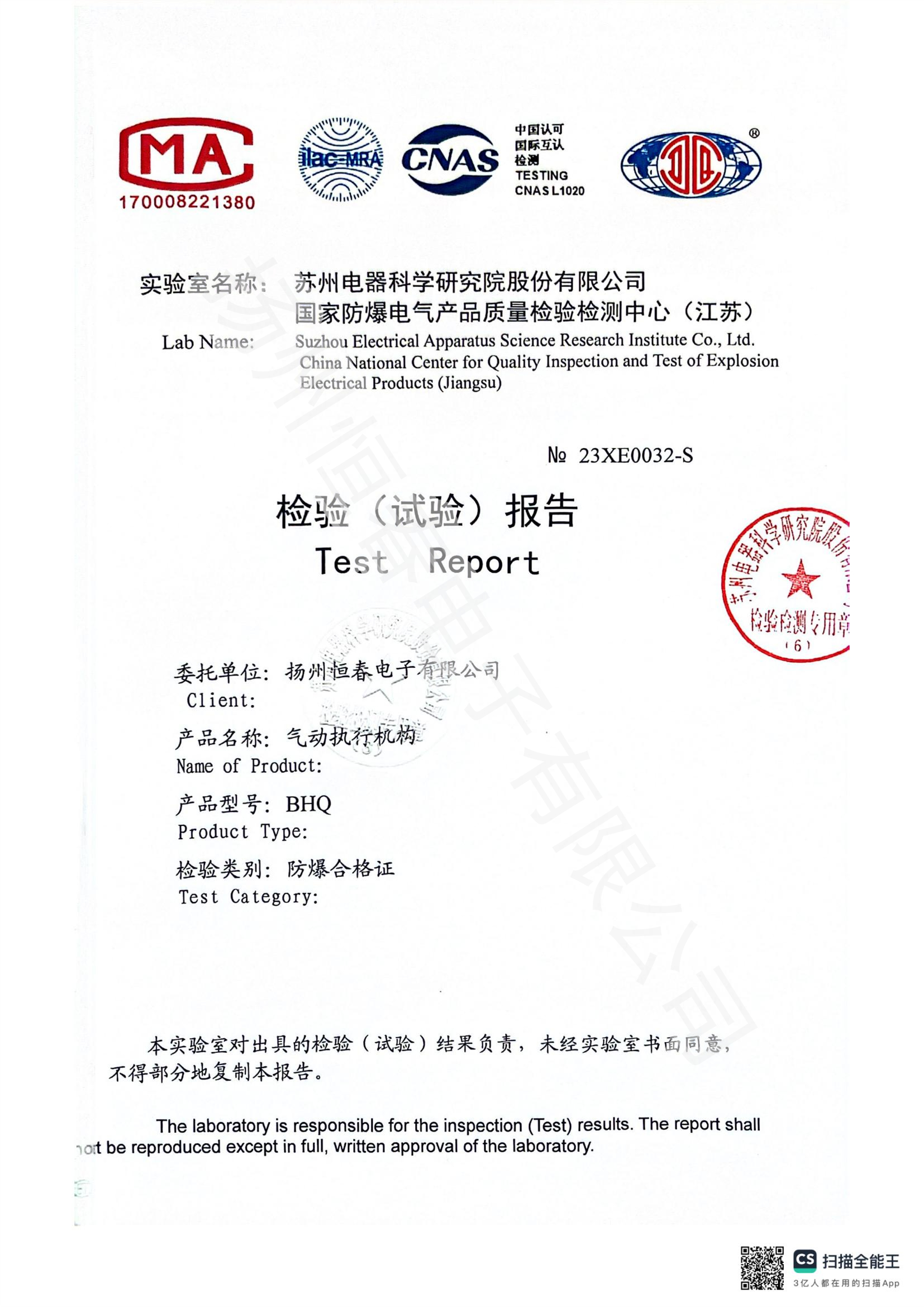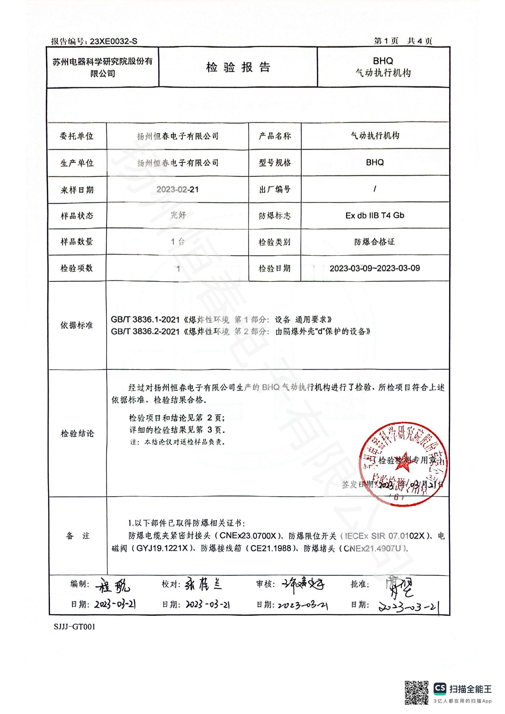 23XE0032-S BHQ气动防爆合格证试验报告