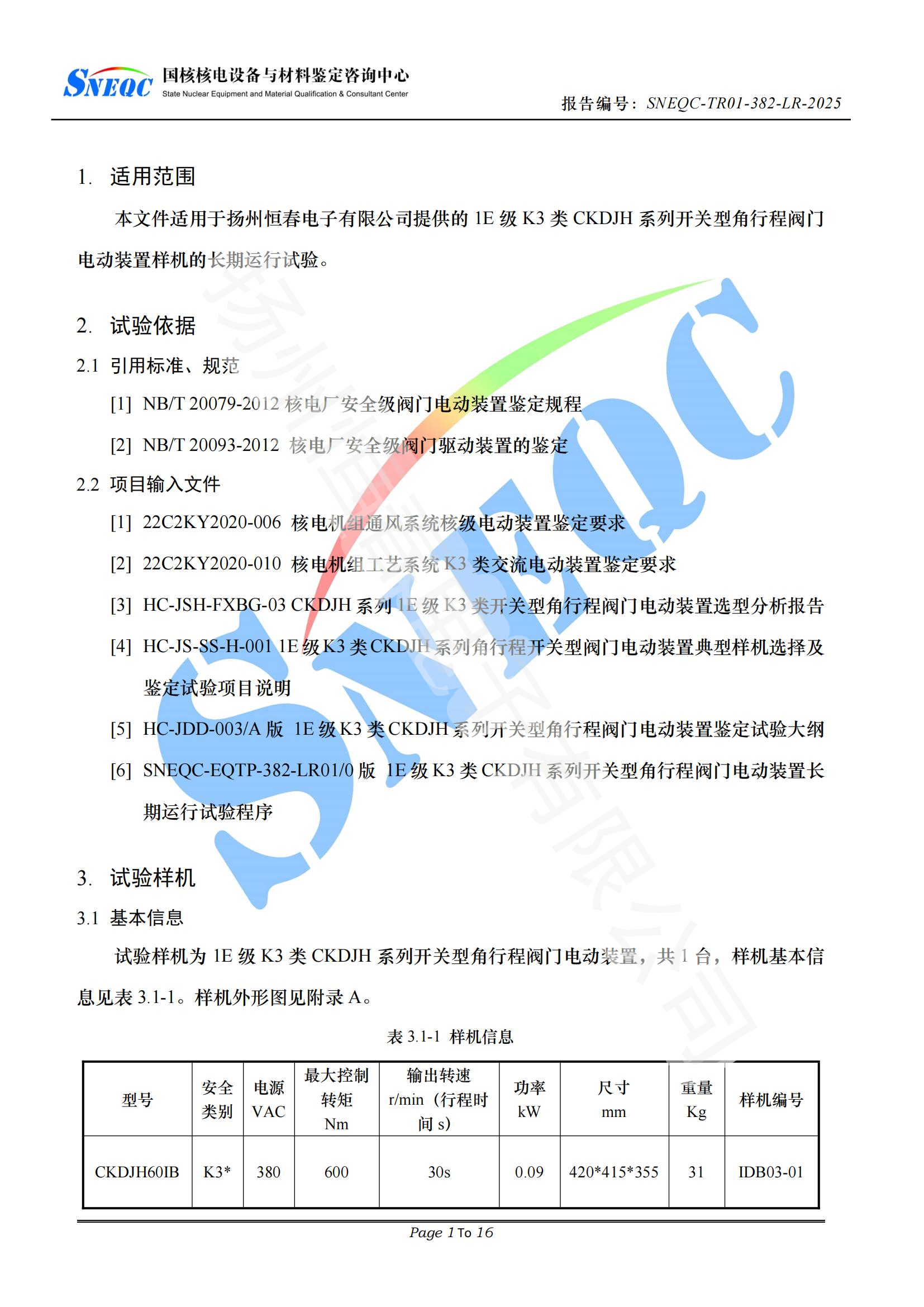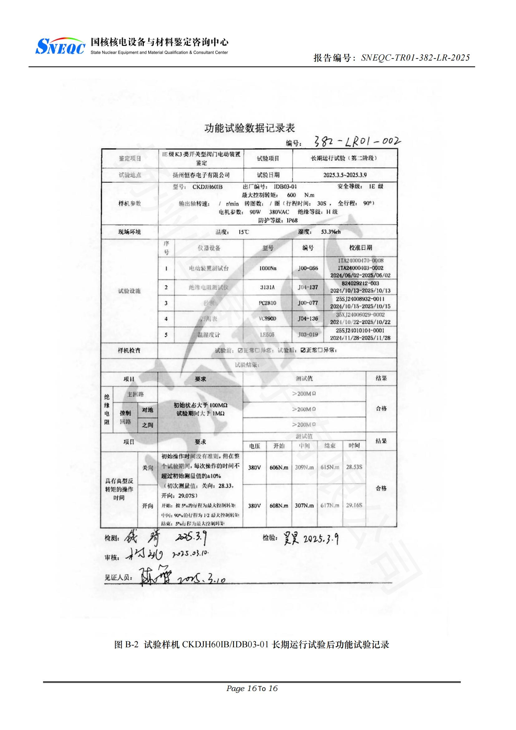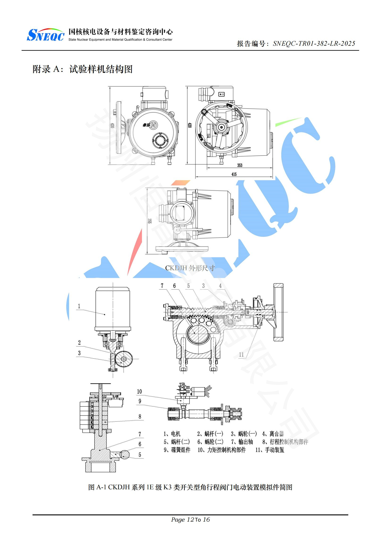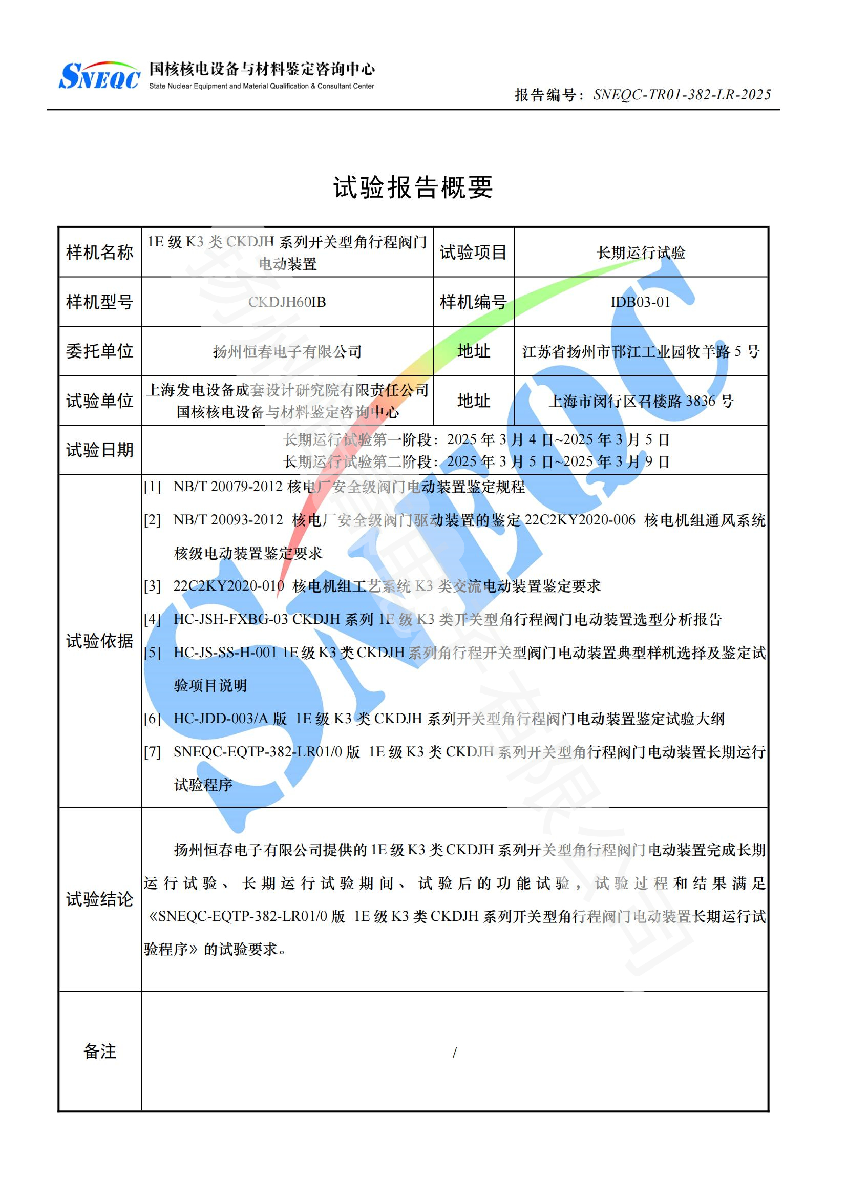 SNEQC-TR01-382-LR-2025 1E级K3类CKDJH系列开关型角行程阀门电动装置长期运行试验报告