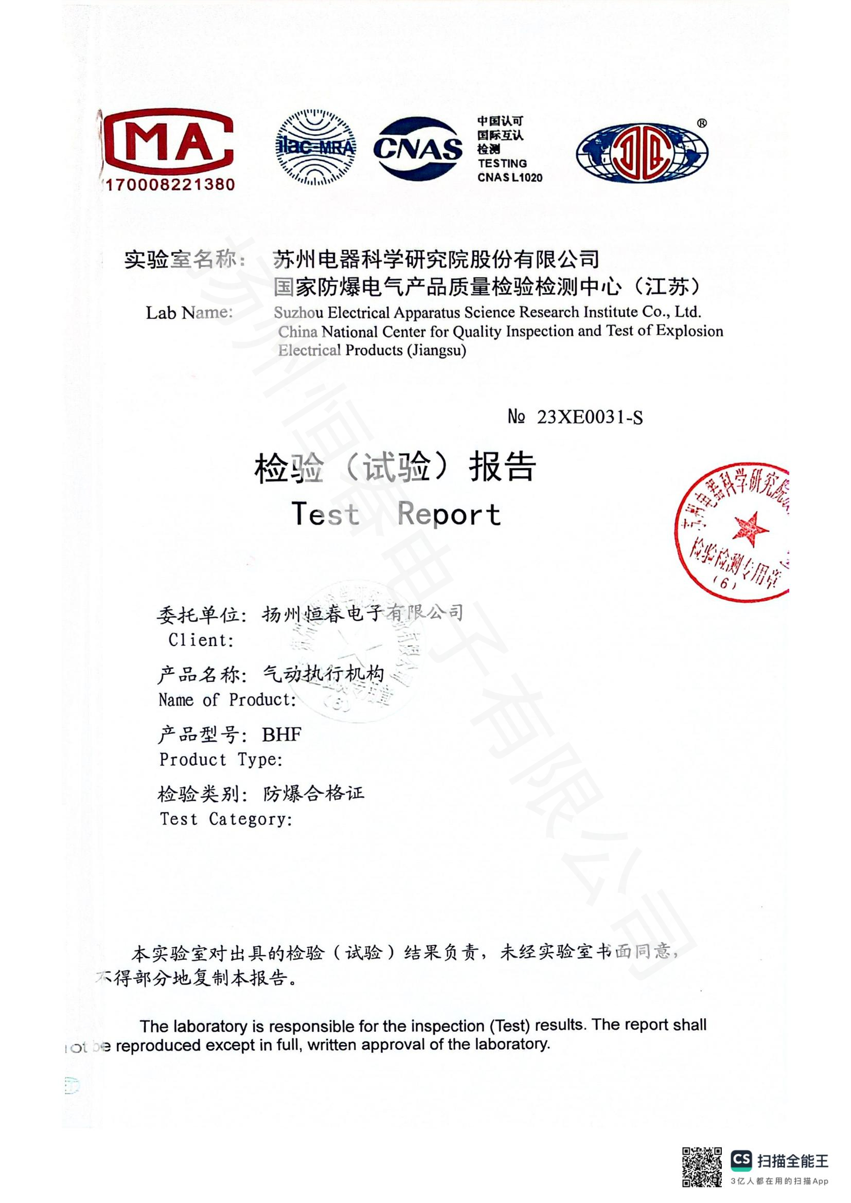 23XE0031-S BHF气动防爆合格证试验报告