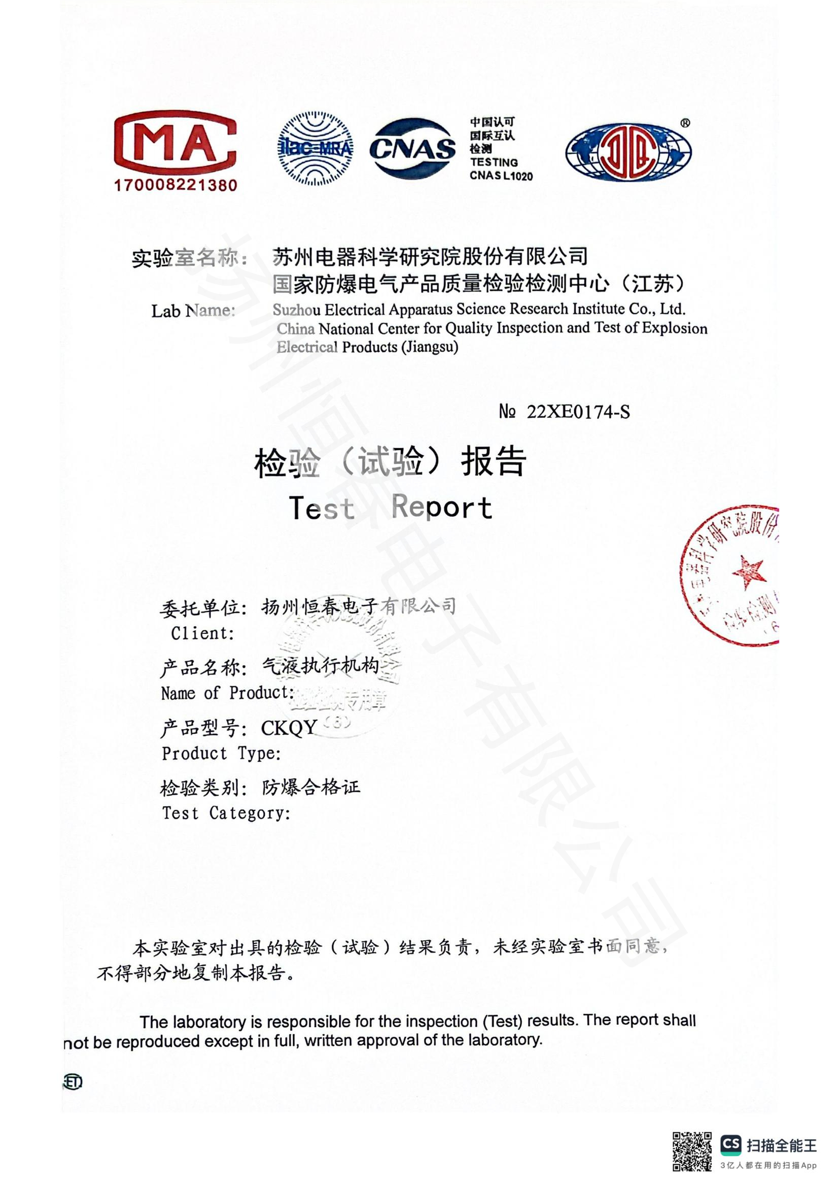 22XE0174-S CKQY防爆合格证试验报告
