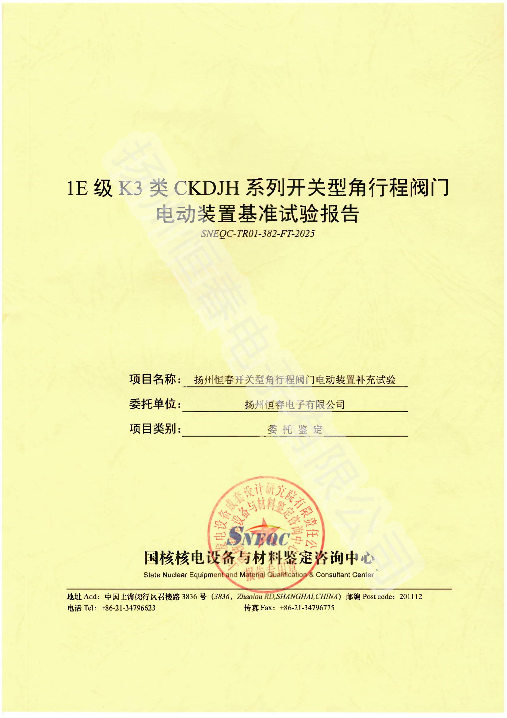 SNEQC-TR01-382-LR-2025 1E级K3类CKDJH系列开关型角行程阀门电动装置长期运行试验报告